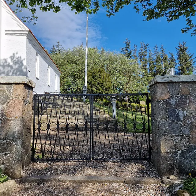 Den også hvidkalkede redskabsbygning i kirkegårdens nordvestre hjørne er opført 1972 efter tegning af arkitekterne Vinter og Roldsgaard, Brædstrup.