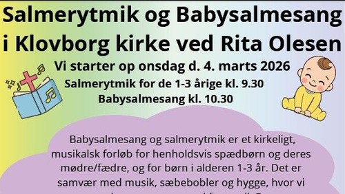 Salmerytmik er et kirkeligt, musikalsk forløb for børn i alderen 1-3 år. Her synges kendte og mindre kendte salmer og sange sammen. Der er fagter til teksterne, samvær med musik, sæbebobler og hygge. Børnene oplever i kirkens rum gennem musikken og salmeteksterne, den dybe samhørighed, at Gud har et ærinde med os mennesker.
